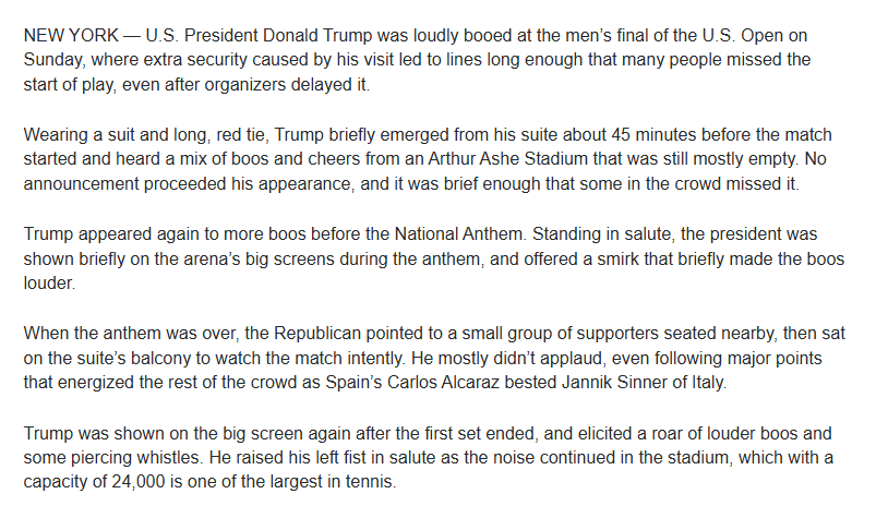 Since returning to the White House in January, and before the U.S. Open began on Sunday, Trump has attended the Super Bowl in New Orleans and the Daytona 500, as well as UFC fights in Miami and Newark, New Jersey, a college wrestling tournament in Philadelphia, and the FIFA Club World Cup Final in East Rutherford, New Jersey. Some of these spectators cheered him, but others booed him on other occasions.