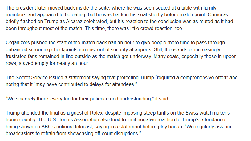 The president then returned to the pavilion, where he was seen sitting at a table with his family. He appeared to be eating, but returned to his seat just before match point. Cameras briefly filmed Trump celebrating, but his reaction at the end was as muted as it had been for most of the match. This time, the crowd’s reaction was also muted.