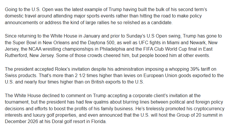 His appearance at the U.S. Open is the latest example of Trump prioritizing major sporting events during his second term, rather than traveling to make policy announcements or shout slogans that he favored during his candidacy.