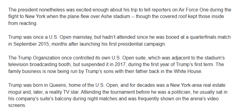 Trump was born in Queens, the birthplace of the US Open, and for decades was a New York City-area real estate mogul and later a reality TV star. Before becoming a politician, he attended the tournament, usually sitting on the balcony of his company suite during the evening matches, and often appearing on the venue’s screens.