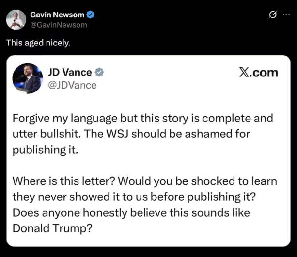 The revelation has also reignited political debate. California Governor Gavin Newsom drew attention to Vice President JD Vance’s earlier remarks dismissing reports of the letter as baseless. In July, when the letter was first mentioned publicly, Vance labeled it “complete and utter bullshit.”